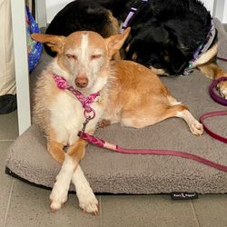Penny kam mit diversen körperlichen Baustellen ungeplant im Dezember 2019 zu uns. Wir haben sie von einem Tierschutzverein übernommen und wussten von ihrem Krebs; eine Milchleiste war schon in Spanien entfernt worden und in der anderen waren deutlich kleine Knoten zu fühlen. Nach ein paar Tagen stellte sich heraus, dass sie taub war. Aber sie wurde mein Schatten und meine Seelenbegleiterin. Leider streute der Krebs weiter bis in die Wirbelsäule, so dass neurologische Ausfälle im Gangbild hinzukamen, bis sie gar nicht mehr alleine aufstehen konnte. Am 6. August 2020 hat sie uns verlassen, aber in unserer intensiven gemeinsamen Zeit hat sie mich umso mehr bestärkt, dass die Ausbildung zur Hundephysiotherapeutin genau der richtige Weg ist – so konnte ich ihr doch noch einige Zeit helfen.